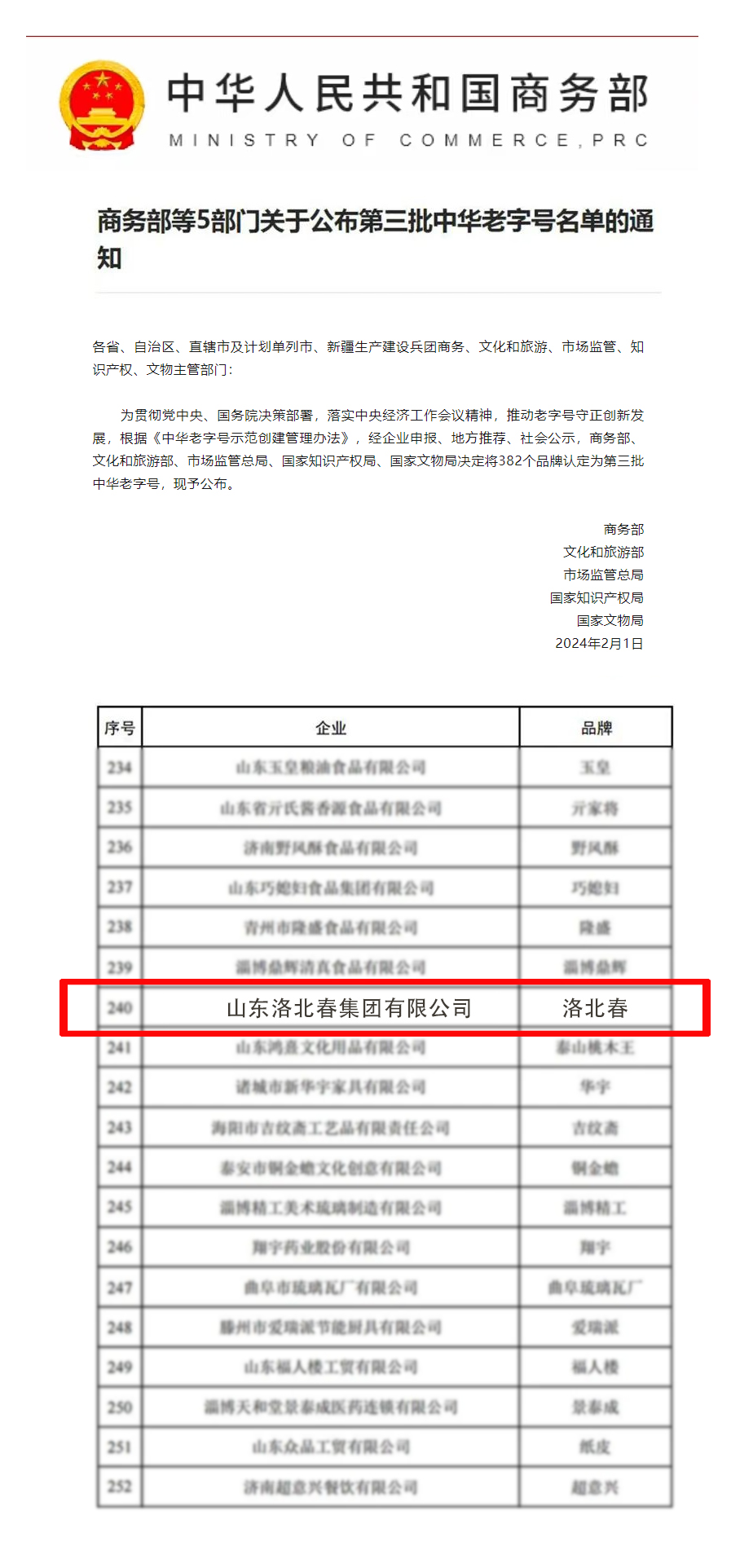 2024年2月1日,国家商务部发布了新一批中华老字号认定通知,根据《中华老字号示范创建管理办法》,经企业申报、地方推荐、社会公示,商务部、文化和旅游部、市场监管总局、国家知识产权局、国家文物局决定将全国382个品牌被认定为新一批中华老字号,其中山东省仅28家企业入选,德州市仅1家入选,即山东洛北春集团有限公司的品牌“洛北春”被认定为“中华老字号”。
