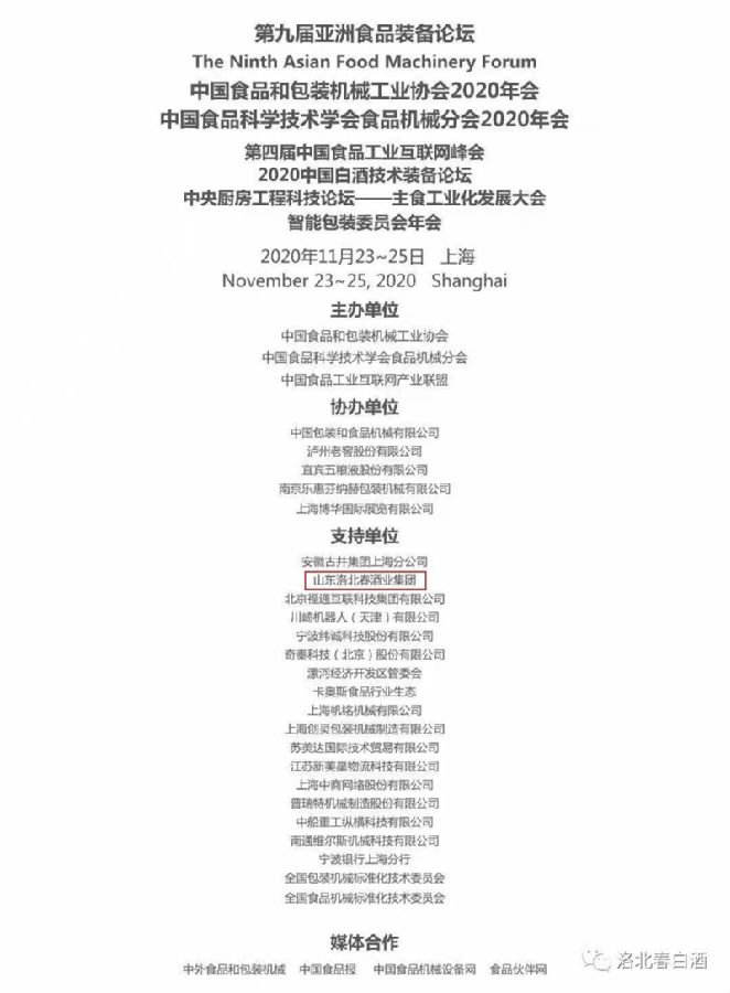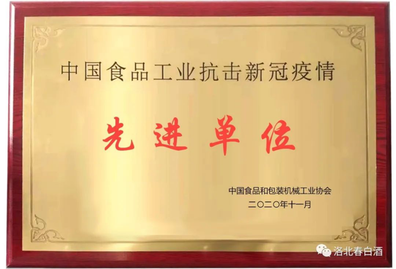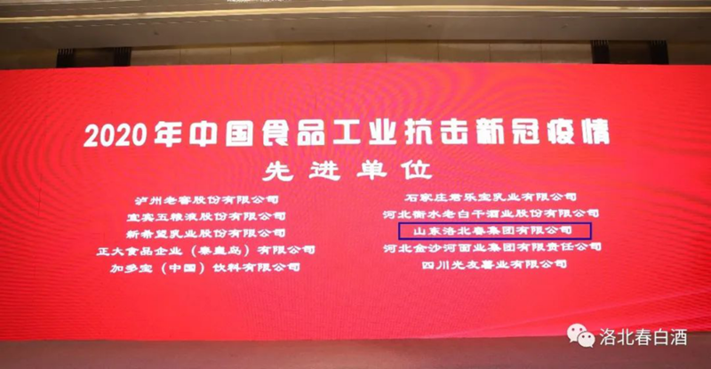 其中山东洛北春集团有限公司作为鲁酒唯一的一家白酒企业,与泸州老窖、五粮液、衡水老白干、加多宝等知名企业同时获得2020年中国食品工业抗击新冠疫情先进单位。