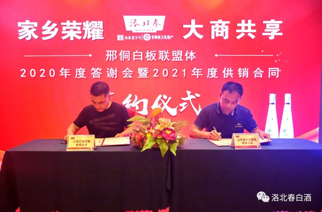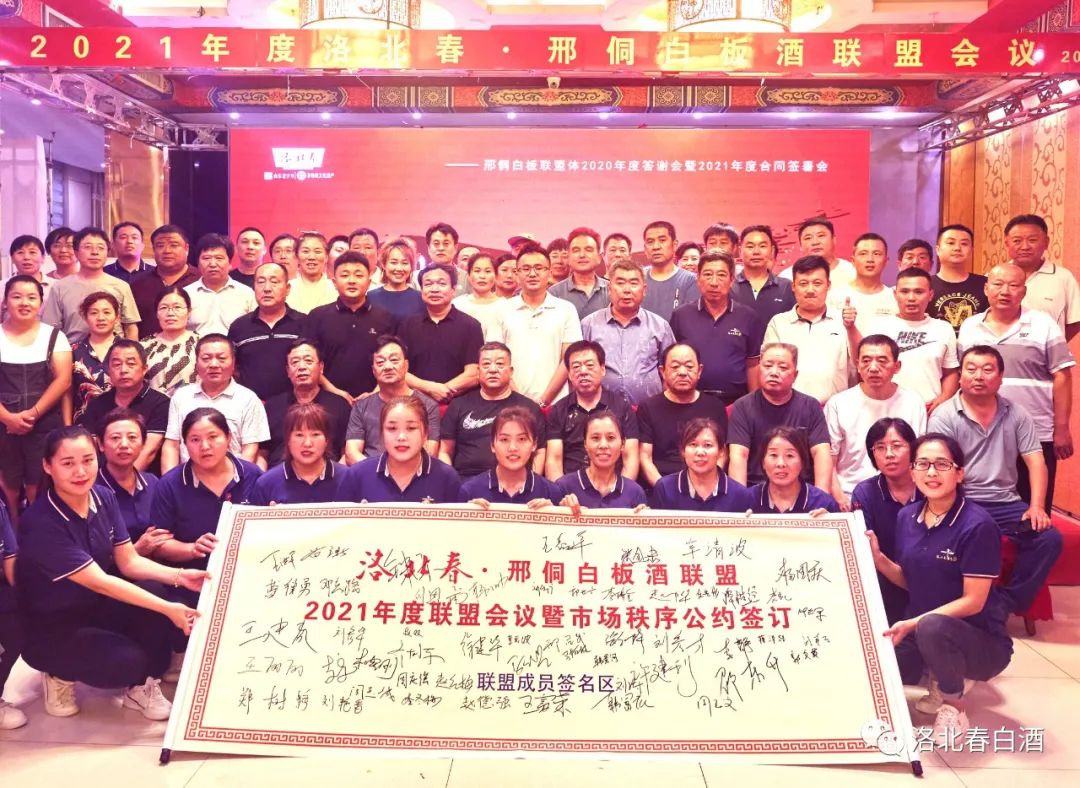 8月2日晚,洛北春2020年度邢侗白板联盟成员答谢会暨2021年度合同签署会议,在洛北春大酒店圆满召开。洛北春集团总经理赵圆、本地事业部负责人韩帅及公司主要领导和邢侗白板酒本地联盟成员、温州汇诚印刷有限公司代表、山东晶玻集团有限公司代表等参加了会议。